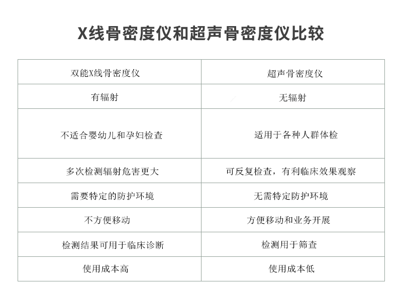 ■ 目前用于臨床的骨密度測量儀器有兩大類,即雙能X線和超聲骨密度測試,雙能X線骨密度儀是行業(yè)檢測標(biāo)準(zhǔn),準(zhǔn)確度高,但從安全性方面超聲骨密度儀有明顯優(yōu)勢,這對人們?nèi)找婷舾械妮椛浔Wo(hù)非常重要,比較如下。